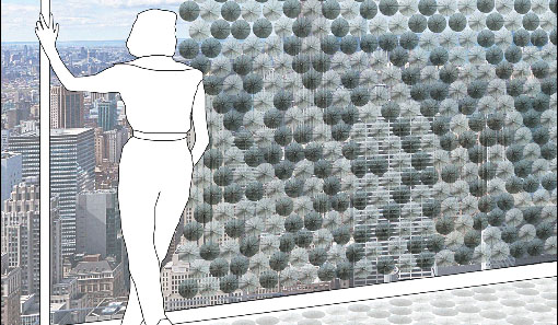 這款遮光墻面,熱量來源是陽光照射。當(dāng)陽光強烈,熱量使得鎳鈦合金線改變形狀,元件上的織物折疊,阻止光照進(jìn)入玻璃墻內(nèi)部。等到日落或者是多云天氣,鎳鈦合金線就恢復(fù)到原先的形狀,讓織物延展,遮光墻表面變透明。