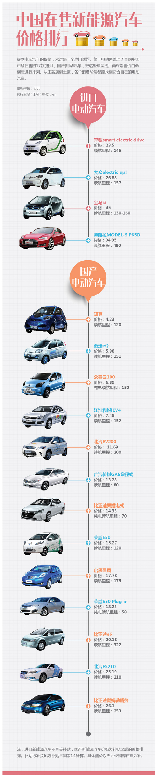 目前中國(guó)市場(chǎng)在售的15款(進(jìn)口、國(guó)產(chǎn))電動(dòng)汽車,小編把這些車型的廠商建議零售價(jià)由低到高進(jìn)行排列。從工薪族到土豪,各個(gè)消費(fèi)階層都能找到適合自己的電動(dòng)汽車。