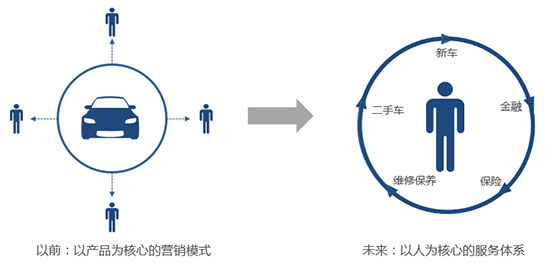 我們看汽車行業的互聯網化改變了什么。一個最根本的改變是目前以產品為核心的營銷模式,逐步的過渡到以人為核心的服務體系。一次性的銷售,讓金融、維修、二手車這塊形成一個整合的體系,這里面新車、保養、維修,有些是節點性的營銷閉環,或者獨立的營銷結點,有的就是鏈條式的。就像一個機器,有的是齒輪,有的鏈條,不承擔獨立的營銷任務。哪些是鏈條,哪些是節點,我們可以根據他們的這個屬性來看,不同的操作主體有不同的理解,我只是想大概談一下原理。總而言之,我們要把這個產品的消費模式過渡到以人為服務的整體模式上來。