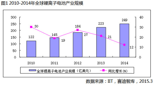 2014年,全球鋰離子電池產(chǎn)業(yè)規(guī)模穩(wěn)步擴(kuò)大至249億美元,同比增長(zhǎng)12%,增幅比2013年下滑9個(gè)百分點(diǎn)。按容量計(jì)算,全球鋰離子電池市場(chǎng)規(guī)模達(dá)到53.6GWh,同比增長(zhǎng)21%。全球鋰離子電池產(chǎn)業(yè)發(fā)展呈現(xiàn)四大特點(diǎn):一是動(dòng)力電池驅(qū)動(dòng)效應(yīng)顯現(xiàn);二是產(chǎn)業(yè)發(fā)展重心進(jìn)一步向中國(guó)轉(zhuǎn)移;三是技術(shù)創(chuàng)新步伐逐步加快;四是產(chǎn)業(yè)整合力度持續(xù)加強(qiáng)。各國(guó)發(fā)展態(tài)勢(shì)不一,日本增速開始回暖,韓國(guó)增速明顯下滑,中國(guó)保持穩(wěn)健增長(zhǎng)勢(shì)頭。