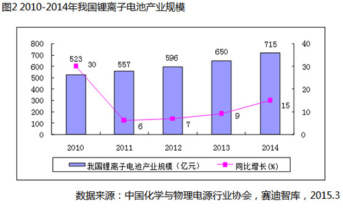 2014年我國(guó)鋰離子電池產(chǎn)業(yè)規(guī)模達(dá)到715億元,同比增長(zhǎng)15%,增幅比2013年提高6個(gè)百分點(diǎn),增速進(jìn)一步回暖。受消費(fèi)電子產(chǎn)品增速趨緩以及電動(dòng)汽車迅猛發(fā)展影響,我國(guó)鋰離子電池產(chǎn)業(yè)發(fā)展呈現(xiàn)出“一快一慢”新常態(tài),即動(dòng)力型鋰離子電池需求快速增長(zhǎng),消費(fèi)型鋰離子電池市場(chǎng)增速明顯放緩。2014年我國(guó)鋰離子電池產(chǎn)業(yè)發(fā)展呈現(xiàn)以下特征:一是國(guó)家高度關(guān)注,電動(dòng)汽車迎來春天;二是政府職能轉(zhuǎn)變,發(fā)展環(huán)境不斷優(yōu)化;三是布局速度加快,鋰離子電池企業(yè)忙轉(zhuǎn)型;四是資本市場(chǎng)活躍,產(chǎn)業(yè)整合勢(shì)頭凸顯。