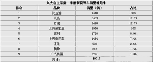 [摘要]據乘聯會統計的數據顯示:今年一季度9大自主品牌累計銷售新能源乘用車1.87萬輛。其中比亞迪表現突出,得益于秦的熱銷,比亞迪繼續領跑新能源車市場以7,418輛高居榜首,占總銷量的近4成。