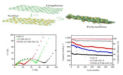 在國家自然科學基金委和中國科學院的大力支持下,中科院蘇州納米技術與納米仿生研究所研究員張躍鋼課題組,圍繞納米硫與石墨烯復合材料的合成及鋰硫電池應用領域開展了廣泛研究。研究人員利用聚苯胺改進氧化石墨烯納米硫復合材料,有效減少電極材料的電荷傳輸電阻,抑制多硫化鋰的溶解,提高了復合材料的放電比容量、庫倫效率和循環穩定性(Nano Research,2014,7,1355-1363)。