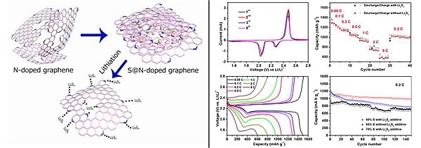 圖2. S@NG作為導電基質材料對多硫化物的吸附和組裝的鋰硫電池電化學性能(Nano Letters,2014, 14, 4821−4827)