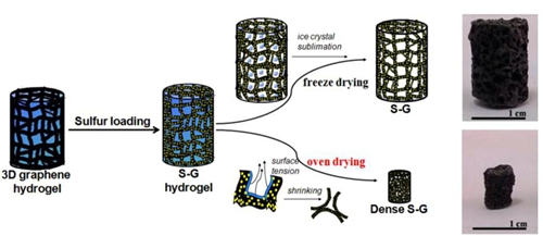 此外,課題組成員運用低溫反應,減緩化學反應速率,在3D還原氧化石墨烯上負載均勻的硫膜,并在空氣中干燥使得3D還原氧化石墨烯孔洞收縮,得到致密的S-G復合材料,增強S與還原氧化石墨烯的粘附,固定納米硫和抑制多硫化物的溶解損失,提高了S石墨烯復合材料的比容量和循環穩定性(Nano Energy,2015,12,468-475)。