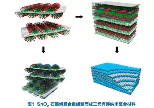 鋰離子電池方面。鋰離子電池通過鋰離子在正負兩極之間的移動來進行工作,因此電池正極材料的導電性能則會密切關系到鋰離子電池的能量密度和功率性能。實際上,大部分電極材料的比容量都與理論上可達到的比容量相距甚遠,尤其是在大電流充放電時,電極材料的比容量會大幅下降。石墨烯材料因具備優異的電子導電性,被應用到鋰電子電池的研究中。石墨烯層應用于電池的正極材料中,不僅可以減少電池的界面電阻,便于鋰離子在電池的正負兩極間傳導,還有助于減慢金屬氧化物溶解相變的速度,從而保證鋰電池的電極在電循環周期中保持結構。有科學家采用三元共組裝法,將氧化錫與石墨烯整合在一起,與表面活性劑多元協同,制備出三元有序納米復合材料(見圖1),該材料用于電極的比容量可達到760 mA•h/g,且該材料是一種良好的緩沖材料,利于提高鋰離子電池電極材料的循環穩定性。