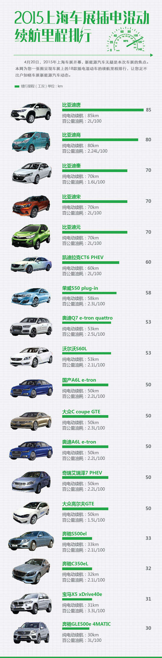 [摘要]4月20日,2015年上海車展開幕,新能源汽車無疑是本次車展的焦點。本網為您一張圖呈現車展上的18款插電混動車的續航里程排行,讓您足不出戶知曉新能源汽車動態。