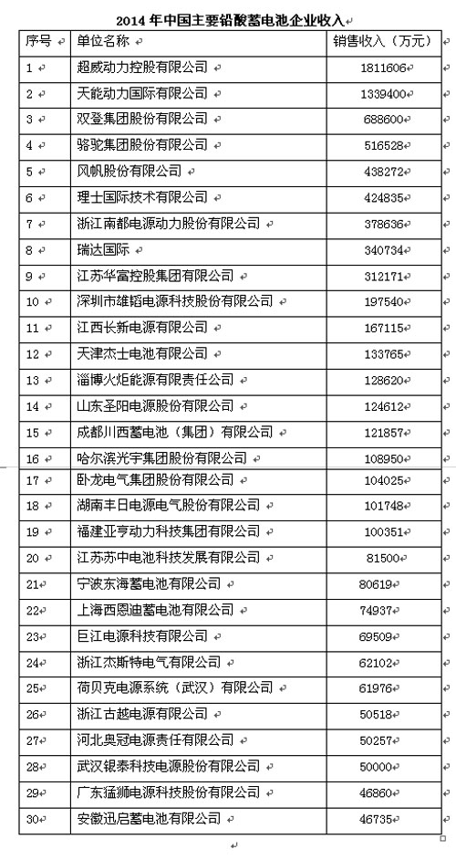 中國化學與物理電源行業協會于2015年5月24-25日在佛山金太陽酒店召開了“2015年第四屆中國電池市場年會”。本次會議上,協會劉彥龍秘書長發布了“2014年度中國電池行業百強企業名單”,排名以2014年度企業產品銷售收入為主要依據,并參考利潤總額、出口創匯額等其他經濟指標綜合排定。同時,協會還發布了鉛酸蓄電池前30強企業名單、鉛酸蓄電池出口前10強名單和2014年度鉛酸蓄電池前十大出口目的地。