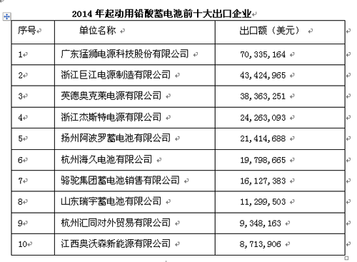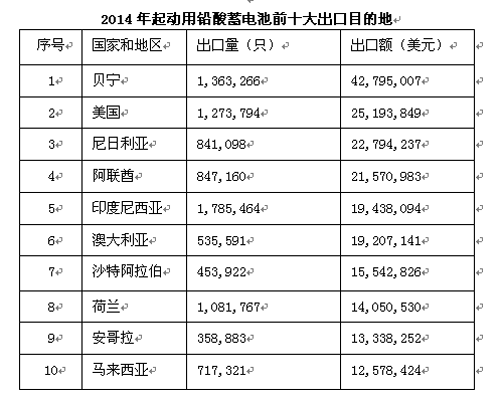 2014年起動用鉛酸蓄電池出口量2125萬只,2013年出口量1809萬只, 同比增長17.4%。2014年出口額4.01億美元,2013年出口額為3.82億美元, 同比增長 4.9%。