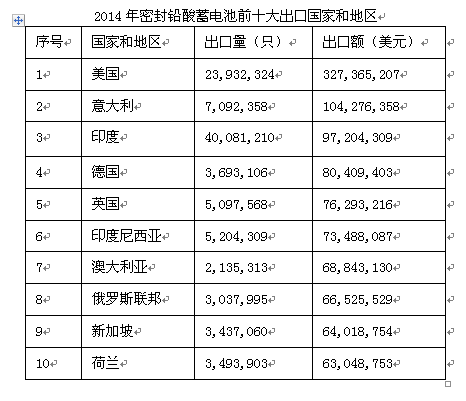 2014年密封鉛酸蓄電池出口量為1.79億只,2013年出口量1.277億只,同比增長40.9%。2014年出口額21.95億美元,2013年出口額為17.48億美元, 同比增長 25.5%。