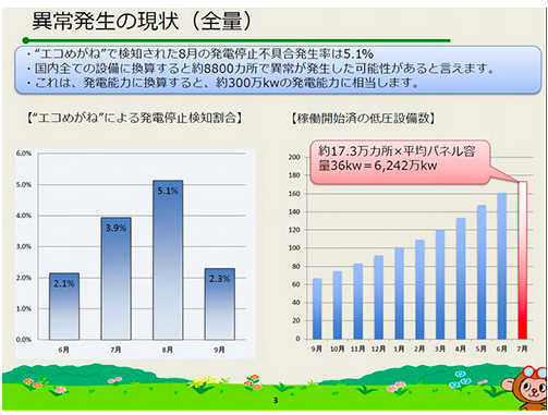 依“生態眼鏡”的用戶中8月份有5.1%的設備停止發電的數值推算,日本全國已啟動的所有低壓光伏發電系統中,約8800座發電系統停止發電。這類停止發電的情況如果不采用遠程監控系統,就很難迅速掌握。據稱日本全國投入運轉的約17.3萬件低壓發電系統中,約80%尚未設置監控系統。低壓項目因允許停止后自動恢復,因此有的會自動再并網售電,但手動恢復模式下,如果不知道發電停止,可能就會造成售電量減少。