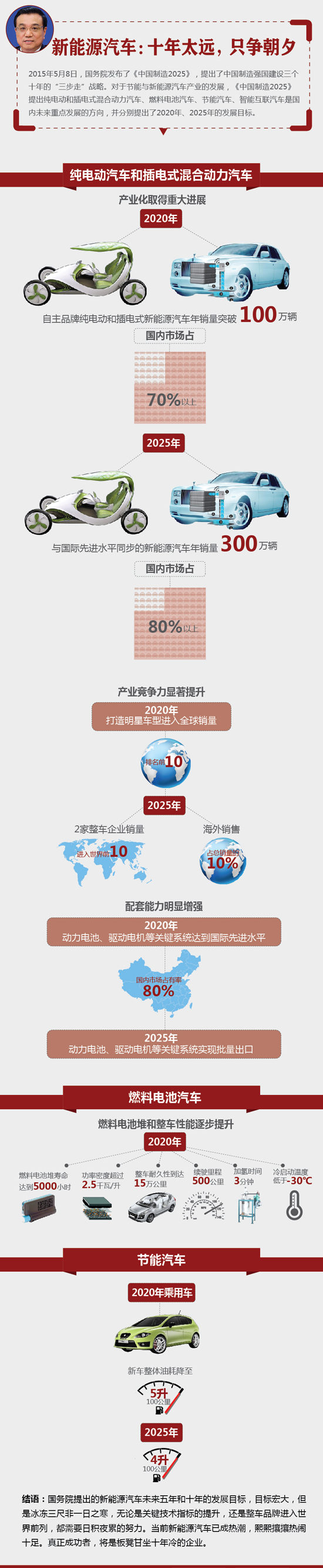 2015年5月8日,國務院發布了《中國制造2025》,提出了中國制造強國建設三個十年的“三步走”戰略。對于節能與新能源汽車產業的發展,《中國制造2025》提出純電動和插電式混合動力汽車、燃料電池汽車、節能汽車、智能互聯汽車是國內未來重點發展的方向,并分別提出了2020年、2025年的發展目標。
