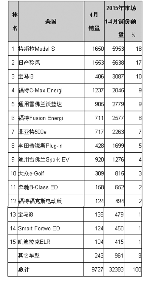 日產(chǎn)聆風(fēng)當(dāng)月交付1553輛,今年前4個月累計銷售5638輛,自2010年12月在美國以來的歷史交付量已接近78000輛。聆風(fēng)迄今為止是世界上最暢銷的電動車,今年夏天全球銷量有望突破20萬輛。增程型電動雪佛蘭沃藍(lán)達(dá)(Volt)4月銷售905輛,這是去年12月以來最高的單月銷量。在全新2016款沃藍(lán)達(dá)下半年上市前,現(xiàn)款沃藍(lán)達(dá)還要繼續(xù)煎熬,今年前4個月累計銷量僅為2779輛,自2010年12月上市后的歷史累計銷量達(dá)到76136輛。寶馬i3的銷量環(huán)比降幅顯著,4月在美國僅賣出406輛,這是去年7月以來的最低水平。今年1-4月,i3的累計銷量為3087輛,去年開始在美國上市后的歷史總銷量為9179輛。