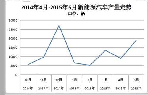 2015年1-5月,新能源汽車累計生產5.36萬輛,同比增長近3倍。其中,純電動乘用車生產2.58萬輛,同比增長近3倍,插電式混合動力乘用車生產1.37萬輛,同比增長3倍;純電動商用車生產9248輛,同比增長近6倍,插電式混合動力商用車生產4761輛,同比增長58%。