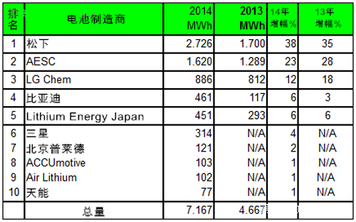 2014年,全球電動汽車鋰離子電池產(chǎn)能井噴,高達(dá)7000 MWh的產(chǎn)量年比增長約54%,全球十大電池生產(chǎn)商排名中,中國比亞迪、北京普萊德、中航鋰電和天能四家廠商赫然在目,進(jìn)步非常迅速。