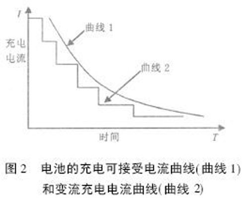理想化的充電過程是充電電流始終逼近可接受的充電電流值。如圖2中曲線2為變流充電電流曲線。圖2中可以看出,在充電初期,充電電流較大,效率較高,克服了恒流/恒壓充電階段初期充電電流設置較小的缺點,隨著充電繼續,充電電流逐步減小,因此,可以將其原有的恒流充電階段用分段恒流充電的過程來代替,達到提高充電效率。