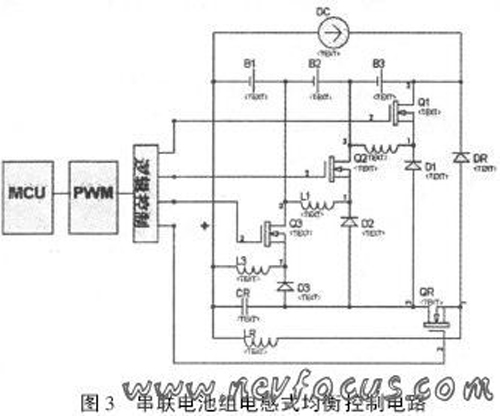 系統中,及時檢測電池組中各電池的狀態信息,送入MCU中,通過算法處理,控制PWM的輸出,驅動開關器件的導通和關斷。當某個電池電壓較高時,相應的開關器件導通,電池將能量儲存到相應的電感中,當開關斷開后,能量轉移到下游的電池,多余能量轉移到公共電容上并回饋給充電電路。
