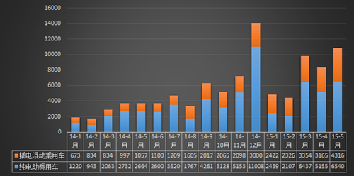 1、2014年-2015年5月新能源乘用車銷售情況(單位:臺)