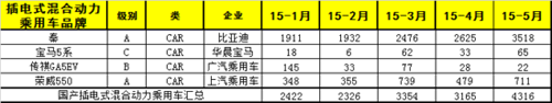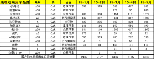 2、2015年前5月純電動乘用車、插電式混動乘用車分品牌銷售情況(單位:臺)