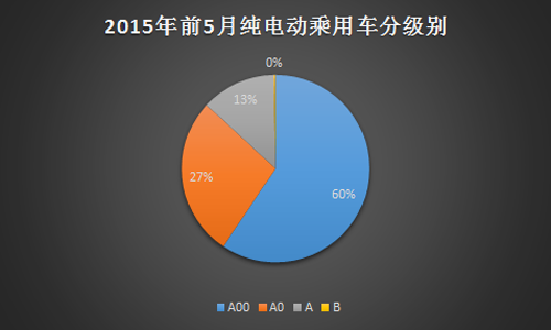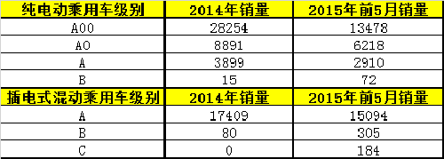 3、2015年前5月純電動乘用車、插電式混動乘用車分級別銷量及占比(單位:臺)