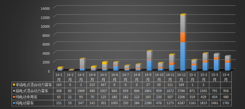 5、2015年前4月新能源商用車銷售情況(單位:臺)