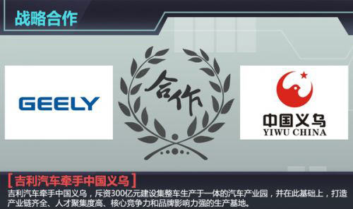 戰略合作協議中強調,通過整合吉利集團發展汽車產業的廣泛資源,借助義烏國際貿易改革發展平臺和國家級義烏經濟技術開發區產業平臺,投資300億元,建設集整車生產于一體的汽車產業園,并在此基礎上,打造產業鏈齊全、人才聚集度高、核心競爭力和品牌影響力強的生產基地。