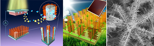 設計制備出由ITO納米線芯層與Cu2S納米晶殼層組裝而成的ITO@Cu2S納米線陣列,使用這種具有三維導電網絡結構的材料制備的量子點敏化太陽能電池表現出優于傳統材料的優異性能(Nano Lett., 2014, 14, 365);通過優選Cu2S納米晶殼層的構筑方法,深入研究其組裝結構中ITO納米線芯層與Cu2S納米晶殼層間界面對電池性能的影響,進一步提高了電池的轉換效率(ACS Appl. Mater. Interfaces, 2014, 6, 15448);在此基礎上,通過網絡化多級組裝設計,在ITO@Cu2S納米線陣列結構基礎上進行了二級和三級結構的組裝,進一步使利用這種對電極材料的量子點敏化太陽能電池的轉換效率提升至6%以上。這種新型對電極材料在電池運行時可有效形成隧道結,通過降低器件的串聯電阻,提高并聯電阻以及填充因子而大大提高了電池的轉換效率,而且解決了傳統金屬銅/硫化亞銅易脫落、無法穩定工作的難題(Nano Lett., 2015, 15, 3088)。