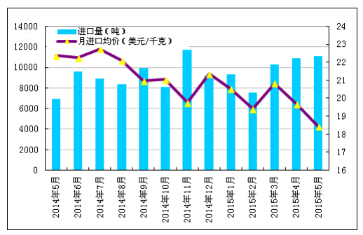 圖1 2014年5月-2015年5月多晶硅進口量及進口均價示意圖 數據來源:海關
