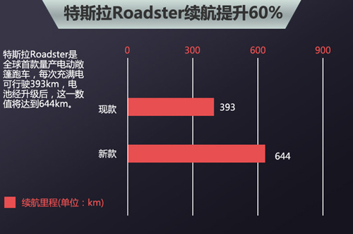 特斯拉Roadster最主要的升級就是續航里程的提升,采用新的電池組使新車的的續航里程提升到了644功率,提升比率達到了60%。特斯拉CEO馬斯克在去年6月的股東會議上曾提及此事,他說:“我們會在今年完成Roadster的升級,這將是一件很酷的事情。我們一定會做到,Roadster會變成一款很酷的跑車。”