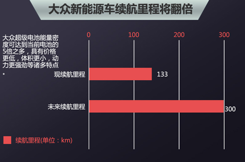 同樣,大眾也有望采用固態電池技術提升續航里程,因為在儲能方面固態電池相對傳統鋰電池存在具有阻燃能力強等優點,安全性能更強。據大眾汽車CEO馬丁·文德恩介紹,大眾正在加利福尼亞州硅谷研發一款超級電池,新電池價格更低,體積更小,動力更強勁。一款電動版大眾品牌車型(在搭載超級電池后)純電動續航里程有望達到300公里。