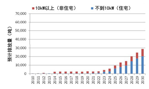 太陽能電池面板在使用20、25、30年時的預計廢置量(出處:日本環(huán)境?。?/p>