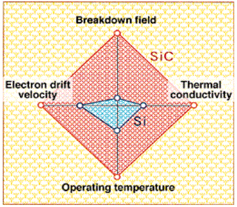 碳化硅物理特性與硅有很大不同。單晶碳化硅比單晶硅具有很多優(yōu)越的物理特性,例如大約10倍的電場強(qiáng)度、大約高3倍的熱導(dǎo)率、大約寬3倍禁帶寬度、大約高一倍的飽和漂移速度。除此之外,在具體的應(yīng)用上,雖然碳化硅器件的工藝難度比單晶硅大很多,但是一旦解決工藝問題,碳化硅器件制造流程短,體積重量小、抗氧化壽命長、輸出功率高的特點,將使其成為遠(yuǎn)優(yōu)于單晶硅的21世紀(jì)理想半導(dǎo)體材料。而且碳化硅材料對電力的能耗極低,按照如果年產(chǎn)40萬片碳化硅晶片襯底的計劃,僅僅應(yīng)用在照明領(lǐng)域,每年減耗的電能就相當(dāng)于節(jié)約2600萬噸標(biāo)準(zhǔn)煤,是一種理想的節(jié)能材料。