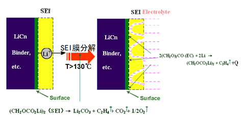 可是當電池內部溫度達到130℃左右時,SEI膜就會分解,導致負極完全裸露,電解液在電極表面大量分解放熱,導致電池內部溫度迅速升高。