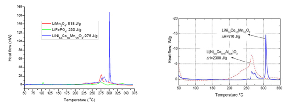 不同的正極材料,其活性物質分解所產生的熱量是不同的,所釋放的氧氣含量也有所不同。磷酸鐵鋰正極材料由于分解時產生的熱量較少,因而在所有的正極材料中,熱穩定性最為突出。鎳鈷錳三元材料分解時則會產生較多的熱量,同時伴有大量的氧氣釋放,容易產生燃燒或爆炸,因此安全性相對較低。