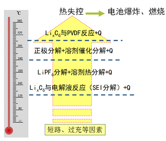 由于電池存儲能量,在能量釋放的過程中,當電池熱量產生和累積速度大于散熱速度時,電池內部溫度就會持續升高。鋰離子電池由高活性的正極材料和有機電解液組成,在受熱條件下非常容易發生劇烈的化學副反應,這種反應將產生大量的熱,甚至導致的“熱失控”,是引發電池發生危險事故的主要原因。