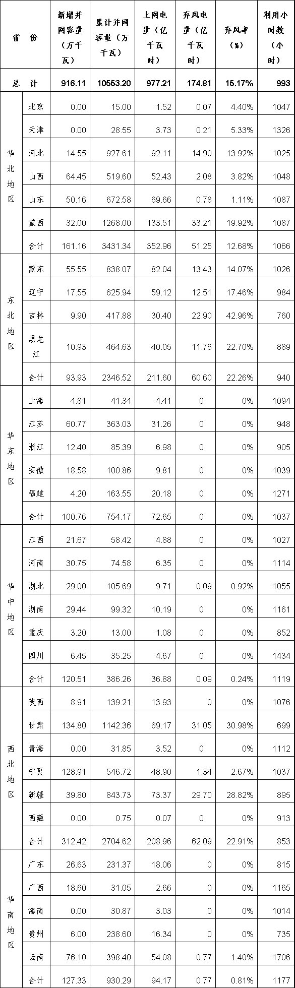 2015年上半年,全國風(fēng)電新增并網(wǎng)容量916萬千瓦,到6月底,全國風(fēng)電累計并網(wǎng)容量10553萬千瓦,累計并網(wǎng)容量同比增長27.6%;上半年,全國風(fēng)電上網(wǎng)電量977億千瓦時,同比增長20.7%;風(fēng)電棄風(fēng)電量175億千瓦時,同比增加101億千瓦時;平均棄風(fēng)率15.2%,同比上升6.8個百分點。上半年全國風(fēng)電平均利用小時數(shù)993小時,同比增加15小時。