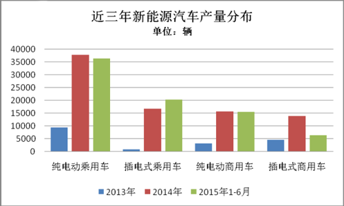 2015年1-6月,插電式混合動力乘用車生產2.04萬輛,同比增長4倍。插電式乘用車在所有新能源車型中增長速度最快。