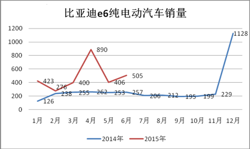 純電動汽車e6主要定位出租車市場,4月因中標武漢純電動出租車項目沖高,5月回落到406輛,6月又上500輛。除了2月受春節假期的影響外,e6電動車每月的銷量都保持在400輛左右,市場銷售相對穩定,1-6月累計銷售2900輛。e6也推出了新版車型,新e6今年2月登入節能與新能源汽車目錄,該車換裝了磷酸鐵錳鋰電池,能量密度進一步提升,續航也得到擴展,新版e6將繼續主打出租車市場。