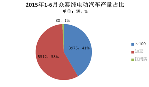 眾泰2015年1-6月生產電動汽車9568輛。旗下主推的車型有眾泰知豆和云100,另外以江南奧拓為原型打造的電動汽車也開始生產。