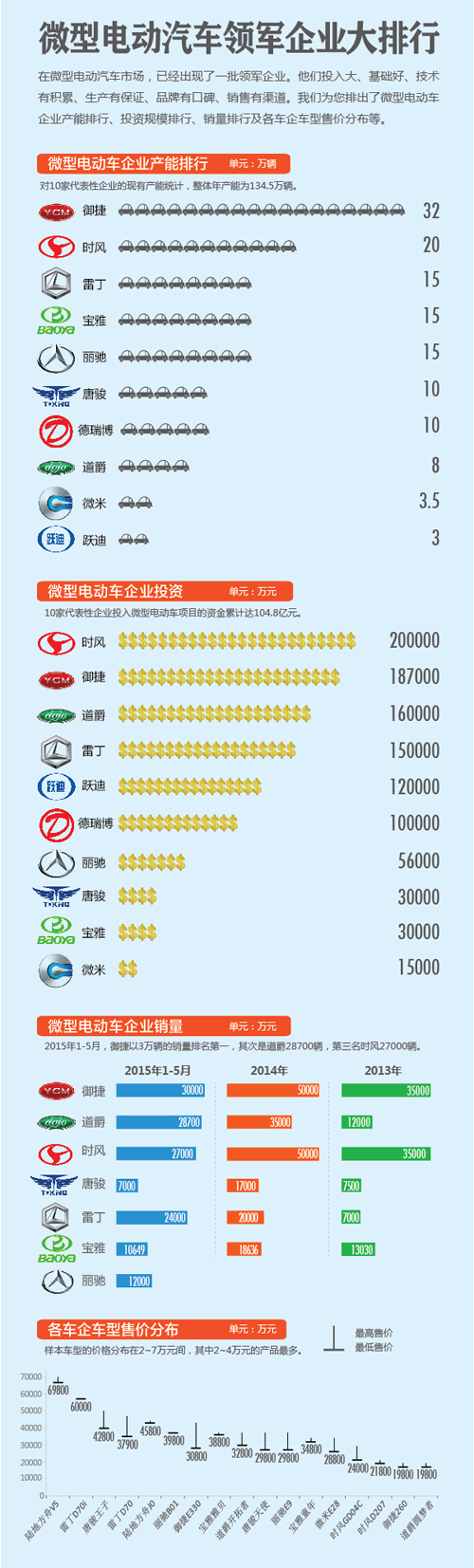 在微型電動汽車市場,已經出現了一批領軍企業。他們投入大、基礎好、技術有積累、生產有保證、品牌有口碑、銷售有渠道。我們為您排出了微型電動車企業產能排行、投資規模排行、銷量排行及各車企車型售價分布等。