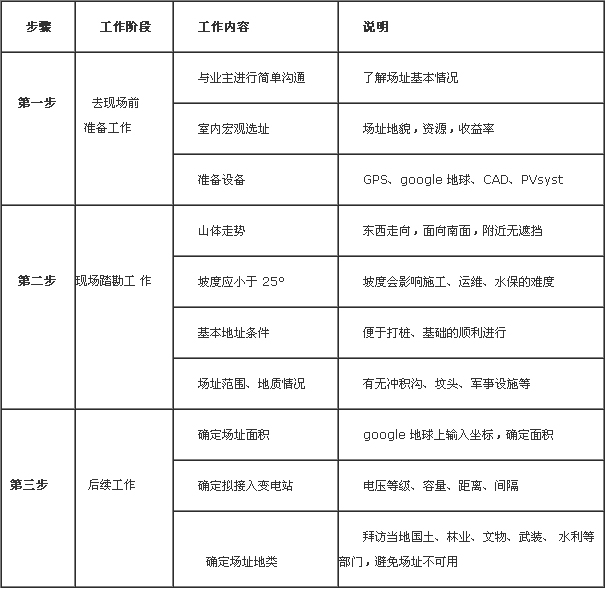 對項目土地(及其周邊)資源、電網情況、當地政策等進行摸底考察。我把現場選址工作劃分成三步,如下表所示: