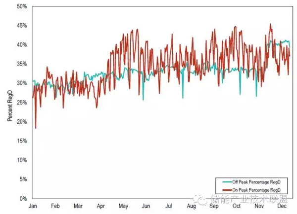 根據PJM電力市場的監管要求,若要保證電力系統的正常運行,PJM市場應當具備700MW的高峰調頻資源和525MW的低谷調頻資源,同時快速調頻的可用容量應當達到237.3MW,其中高峰和低谷快速調頻資源分別為150-250MW和100MW。就2015年而言,在某些月份中快速調頻資源已經占到總調頻資源的42%,有時甚至高達70%,快速調頻服務的價格在$20-50/MW之間(相當于常規調頻服務價格的一半)。
