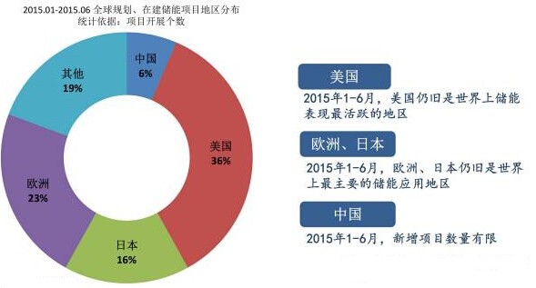 從區域分布來看,美國是上半年規劃或在建項目最多的國家,是全球儲能技術與應用的領頭羊,其次是歐洲,日本等國家,中國在2015年上半年規劃及在建的項目則不多。