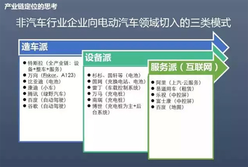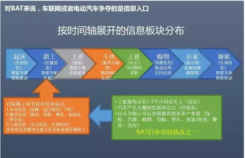 第二、從整個汽車產業鏈的大視角看,BAT(注)們對汽車產業絕對是有野望的,各路IT神仙們紛紛從三個維度切入汽車產業鏈: