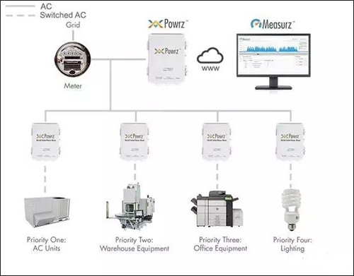 Powrz通過負荷接線箱與建筑物的電氣負載相連,每個負荷接線箱只能連接到一個負載,負荷接線箱的載流能力可選,范圍為60A~1200A之間可選。通過實時監測(一秒一次)建筑物的功率,Powrz可以獲取實時功率需求。如果建筑物的總功率超過特定量,則Powrz將控制系統切斷多達四個建筑物的負荷,一次一個,以減少高昂的電費支出。