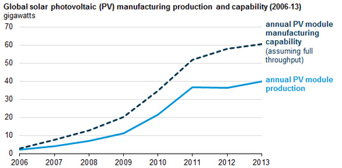 據美國能源信息署(EIA)最新報告顯示,近年來,全球太陽能光伏組件產量增速開始放緩,2006-2011年年均增長78%,2011-2013年下降到4%。同時,由于全球光伏組件裝機容量與產量之間差距的拉大,光伏組件生產的利用率也在不斷下降。