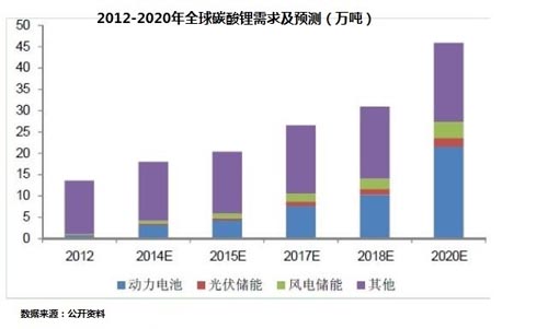 2012年全球碳酸鋰需求僅約13.6萬噸,其中動力電池碳酸鋰需求約0.8萬噸,在總需求占比僅為6%。隨著新能源汽車的逐漸放量,將帶動碳酸鋰市場的需求。預(yù)計15年全球碳酸鋰需求達(dá)到20萬噸,增量主要來自于動力鋰電池,至2020年,預(yù)計碳酸鋰總需求達(dá)到46萬噸,屆時動力電池碳酸鋰需求將接近20萬噸,占比超過40%。