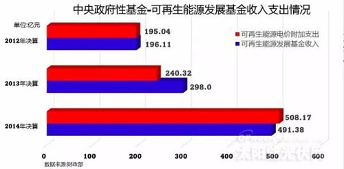 2014年中央財(cái)政可再生能源發(fā)展基金收入的基金只有不到500億元的規(guī)模,相比高速增長(zhǎng)的可再生能源裝機(jī),基金的缺口越來(lái)越大。