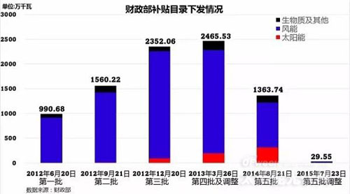不多說(shuō)直接上圖,這是最新的補(bǔ)助目錄發(fā)放情況,若不計(jì)2015年7月下發(fā)的第五批調(diào)整目錄,補(bǔ)助目錄已經(jīng)1年沒(méi)有更新。從裝機(jī)容量來(lái)看,已列入目錄的太陽(yáng)能及風(fēng)能項(xiàng)目合計(jì)8118萬(wàn)千瓦,然而截2015至6月末,太陽(yáng)能及風(fēng)能項(xiàng)目合計(jì)14069萬(wàn)千瓦,意味著約有5000多萬(wàn)千瓦的項(xiàng)目因沒(méi)有列入目錄而拿不到補(bǔ)貼。(全國(guó)并網(wǎng)風(fēng)電裝機(jī)容量10491萬(wàn)千瓦,全國(guó)光伏發(fā)電裝機(jī)容量3578萬(wàn)千瓦,光伏電站3007萬(wàn)千瓦,分布式光伏571萬(wàn)千瓦。)