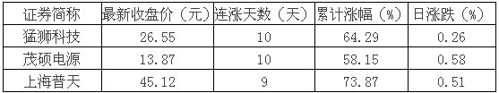 據(jù)證券時(shí)報(bào)股市大數(shù)據(jù)新媒體平臺(tái)“數(shù)據(jù)寶”統(tǒng)計(jì),截至10月20日收盤,猛獅科技、茂碩電源、上海普天3只新能源行業(yè)相關(guān)個(gè)股近日已連續(xù)上漲多日,詳情如下: